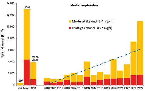Modelleret arealudbredelse af moderat (2-4 mg ilt pr. L) og kraftigt (0-2 mg ilt pr. L) iltsvind midt i september i de indre danske farvande (2010-2024) samt den største og mindste udbredelse (1989-2024) og den gennemsnitlige udbredelse (1989-2009). Den stiplede linje angiver en statistisk signifikant stigning siden 2010. (5)