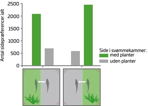 For hvert minut i alle videooptagelser er fiskens side-præference registreret og ses her opgjort i søjlediagrammet med (grøn) eller uden (grå) tang. Svømmekammeret med den kunstige tang er illustreret under grafen. Hundestejlerne foretrak tydeligt siden med tang. Systemet blev også testet spejlvendt for at udelukke utilsigtede effekter i svømmekammeret.