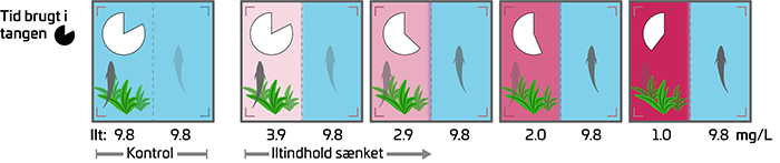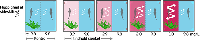 Illustration af svømmekammeret i choice chamber-forsøget, når iltniveau falder fra 9,8 mg ilt pr. L (100 % iltmætning) helt ned til 1,0 mg ilt pr. L (10 % iltmætning). Sideskift er indikeret med størrelsesgraduerede zig-zag pile, og allerede fra 3,9 mg ilt pr. L skifter hundestejlerne mere og mere side i forsøgskammeret. De røde felter viser vandmiljøet, hvor iltniveauet sænkes, og de blå viser det konstant iltrige vand. Hvert trin i iltreduktionen varede 30 minutter, inden iltmængden blev sænket yderligere.