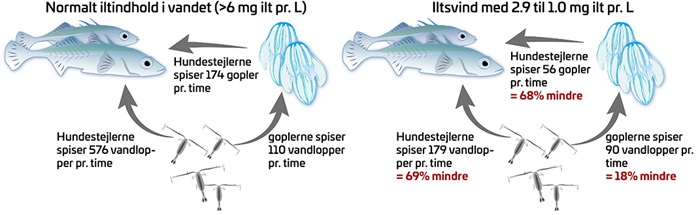 Fødeindtag hos hundestejler og dræbergopler. Her ses, hvor mange vandlopper (Acartia tonsa) og gopler, hundestejlerne spiser, samt hvor mange vandlopper goplerne spiser pr. time. I venstre side ses det normale indtag under gode iltforhold. Til højre i figuren ses, hvad der sker, når iltindholdet reduceres til mellem 2,9 og 1 mg ilt pr. liter (30 til 10 % iltmætning). Med røde tal ses, hvor stor en reduktion i byttedyrsindtag, der måles under iltsvind i forhold til under iltrige forhold. Hundestejlerne spiser 68 % færre gopler og 69 % færre vandlopper under iltsvindet, hvorimod goplerne kun reducerer deres vandloppeindtag med 18 %! (4). Iltsvind er derfor alvorligt for fiskene, mens goplerne er næsten upåvirkede.